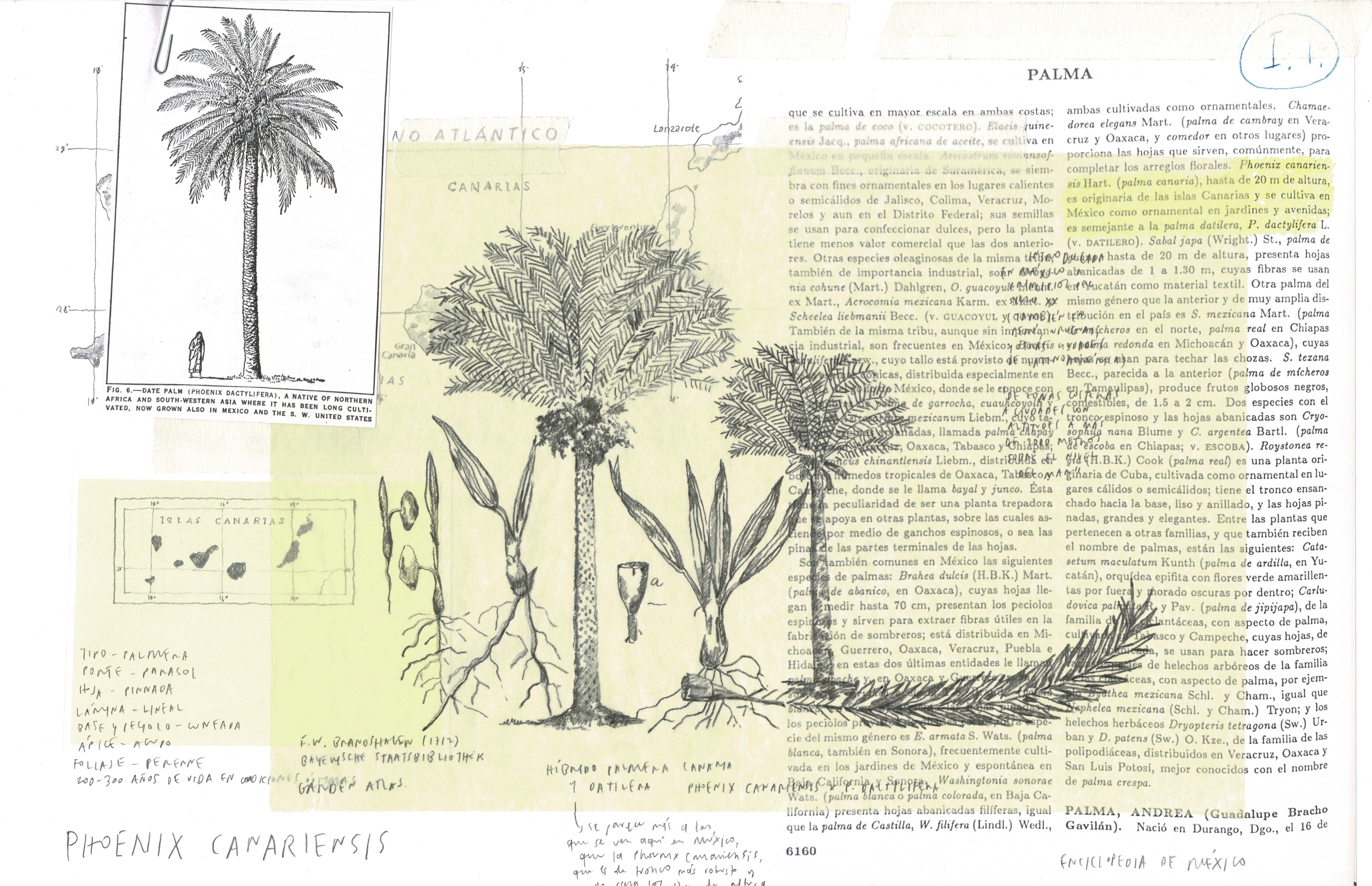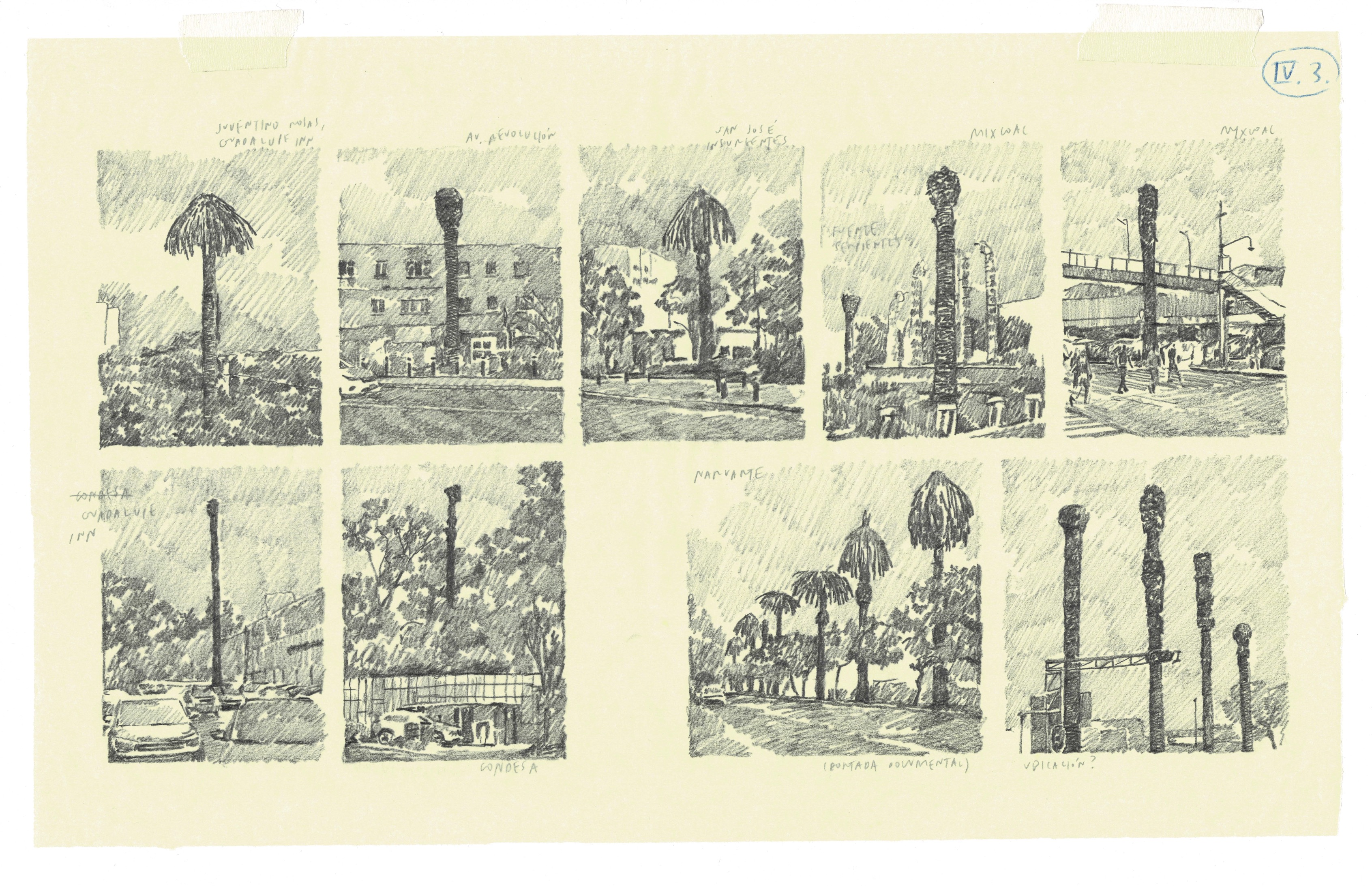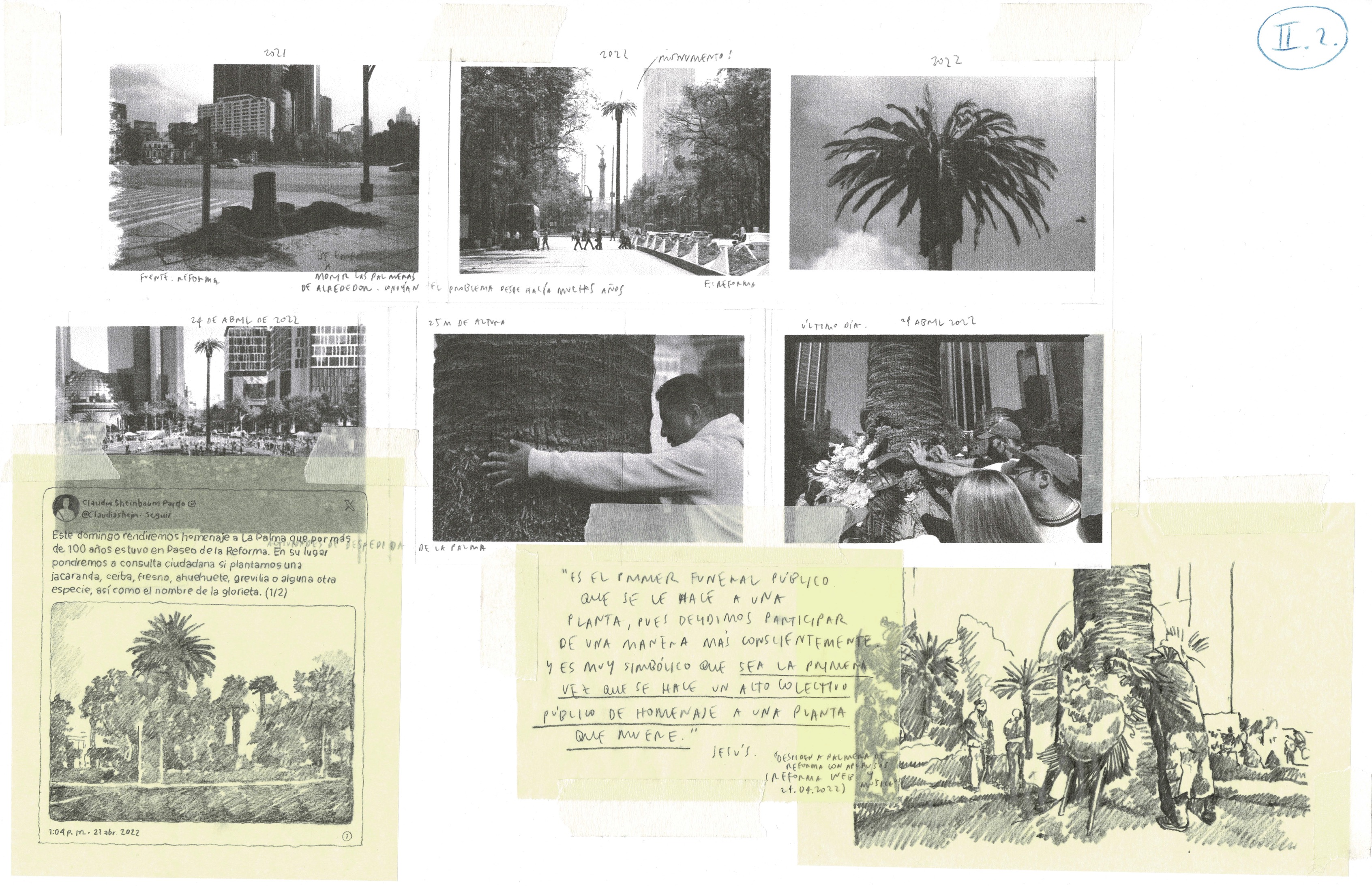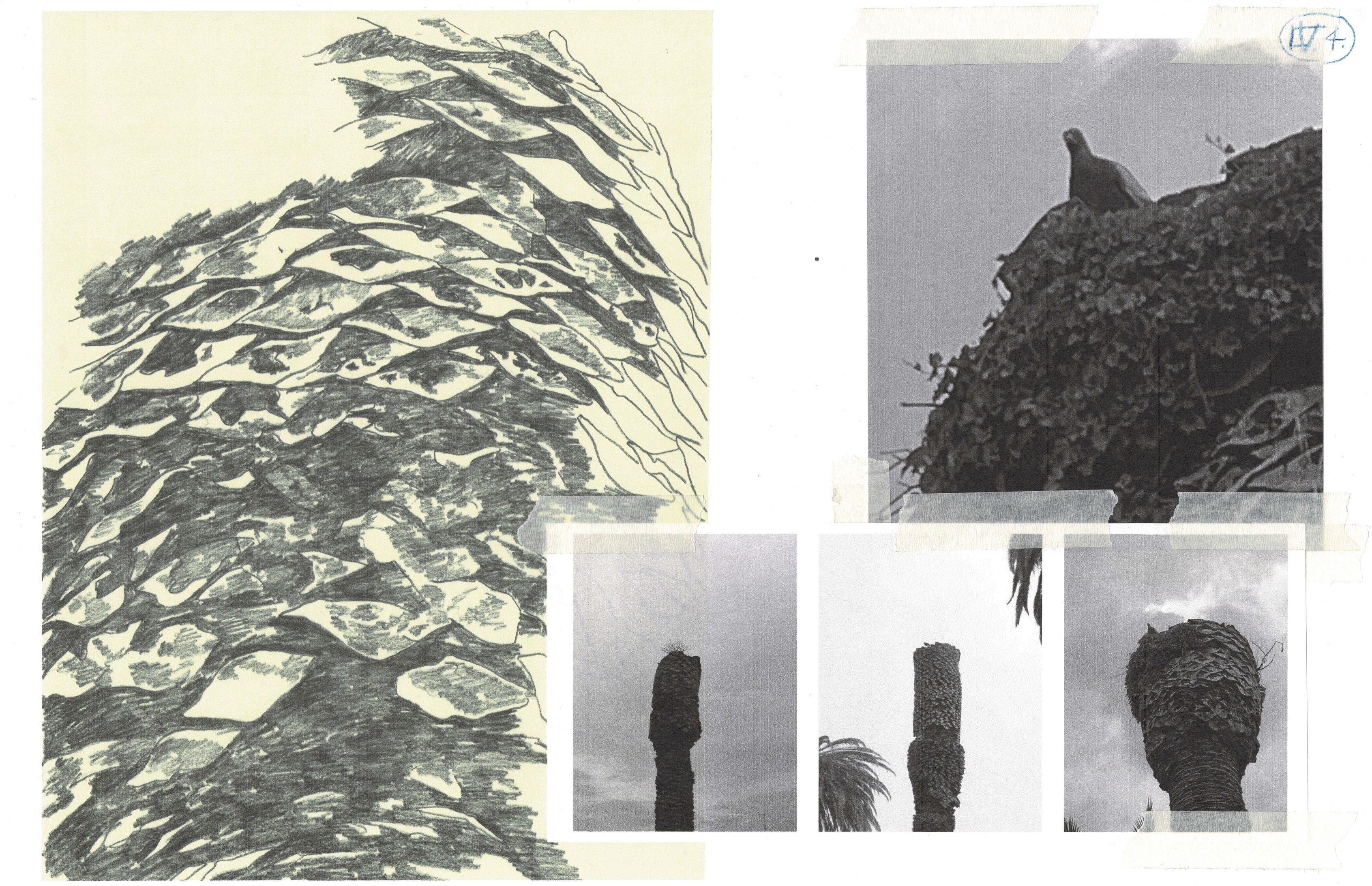 El archivo gráfico recopila fotografías, información publicada y asociaciones personales en torno a la muerte de las palmeras, y utiliza el dibujo y el collage como herramientas de investigación. Organizado en capítulos de estudio, el archivo explora la procedencia de esta especie de palma, la llegada a la ciudad a principios del siglo XX como ornamento, la presencia urbana y el arraigo social, así como las causas y consecuencias de su muerte. El trabajo es una reflexión acerca de la transformación del paisaje urbano —y de nuestra relación como habitantes con él— como consecuencia del cambio climático. Los troncos de las palmeras muertas permanecen como monumentos del siglo XXI.