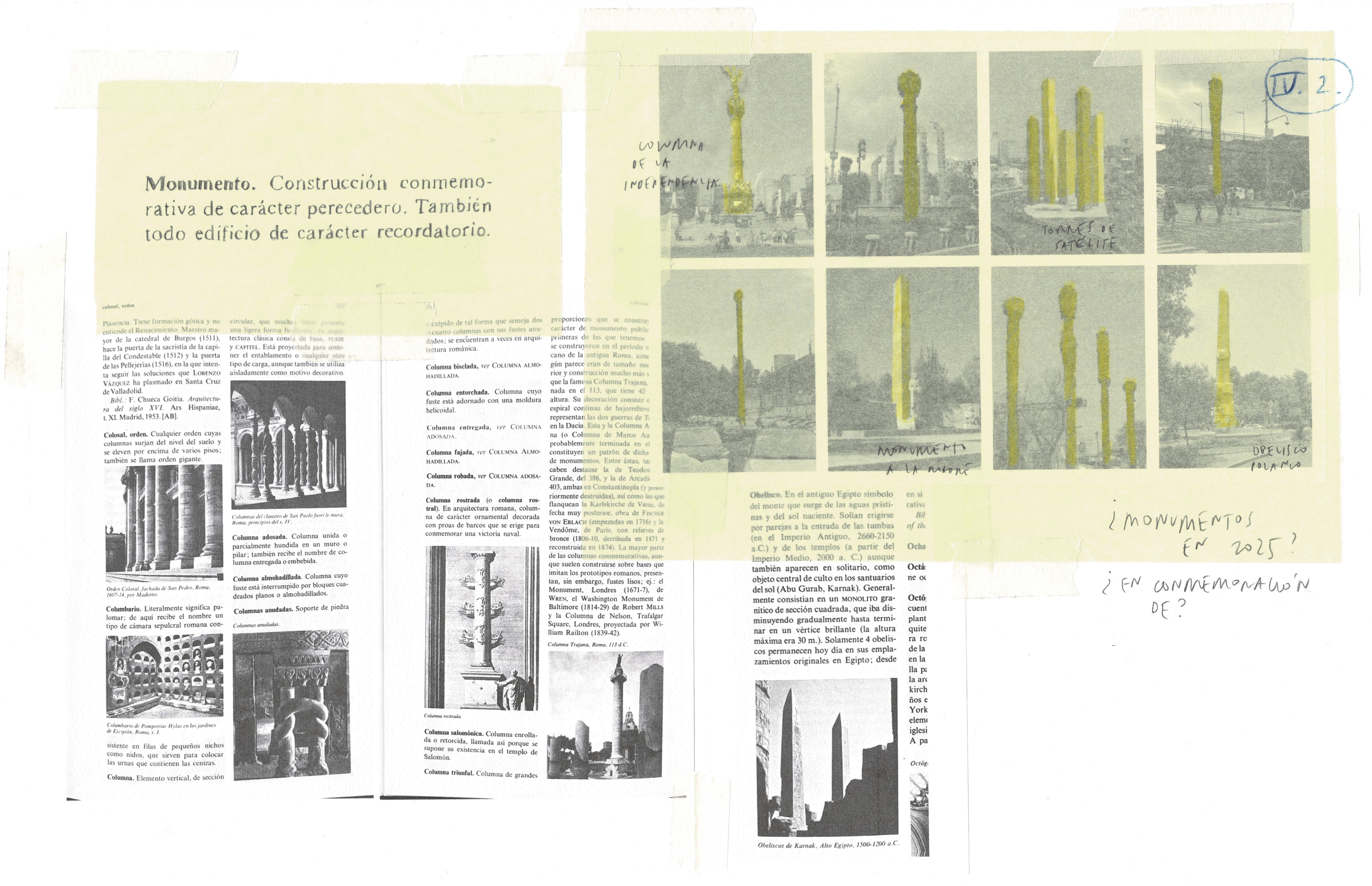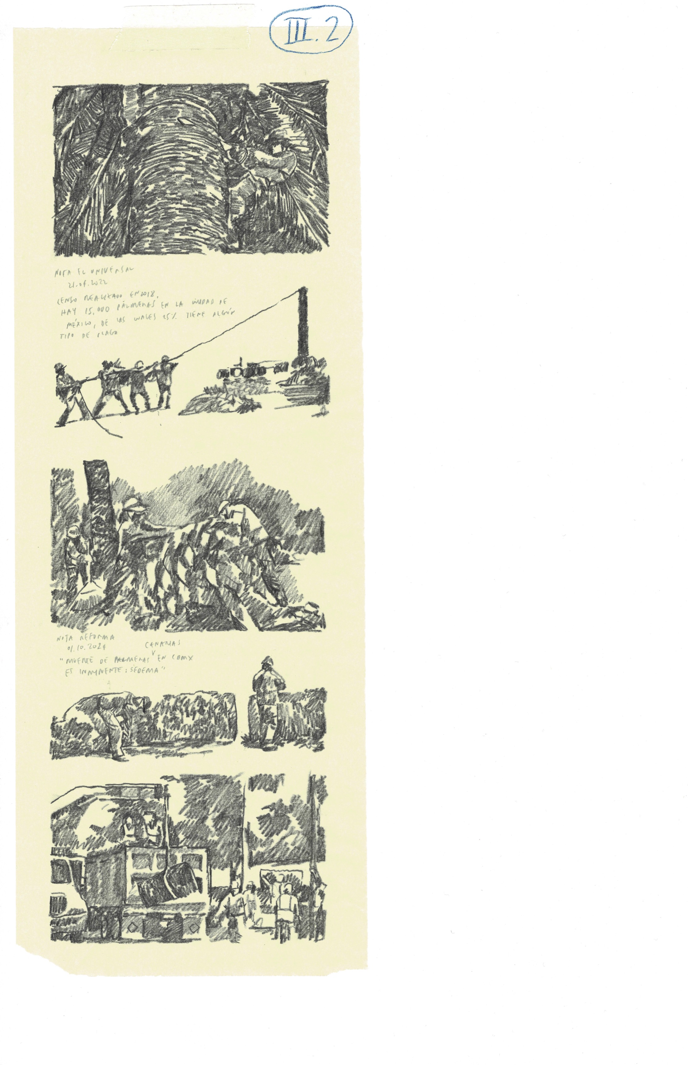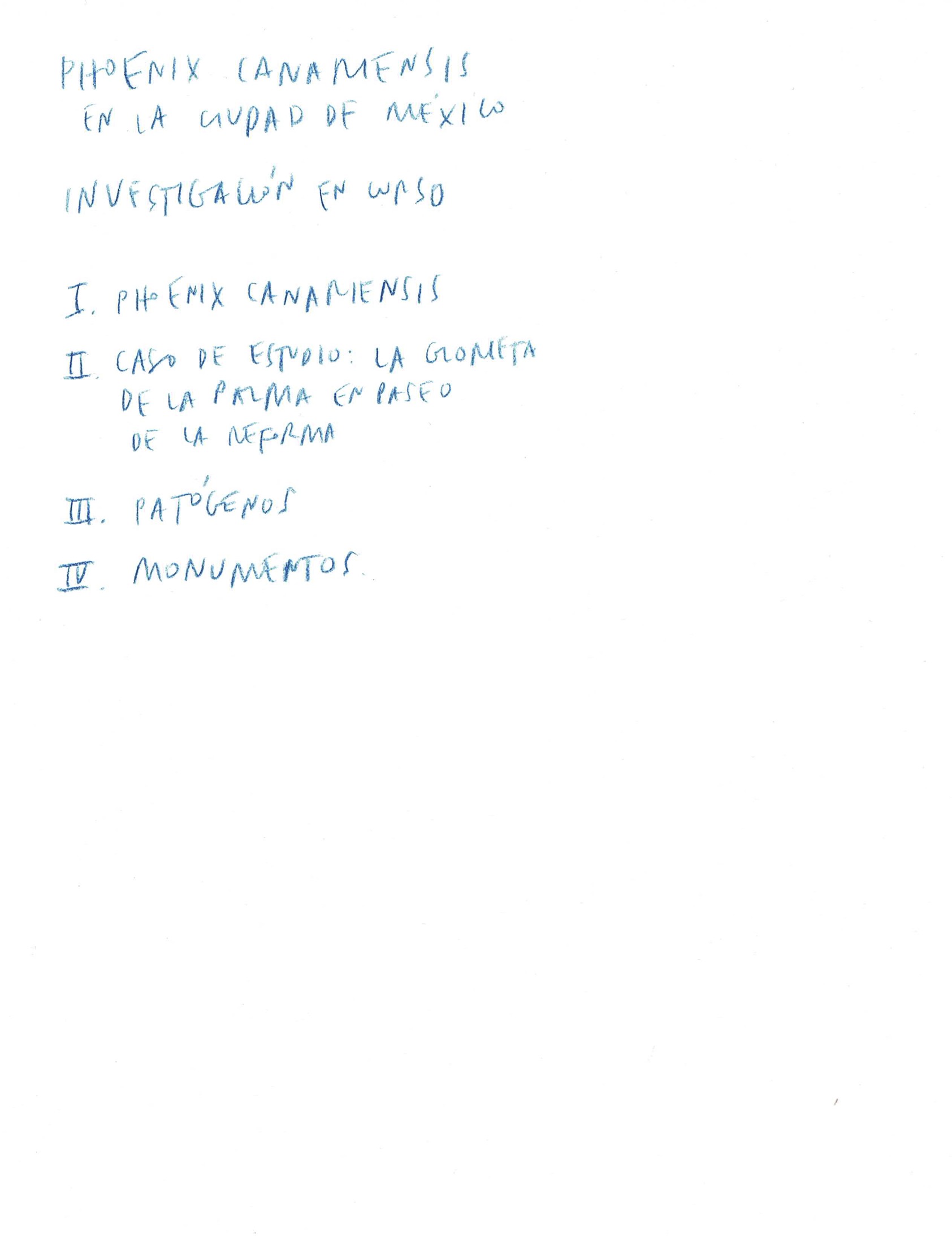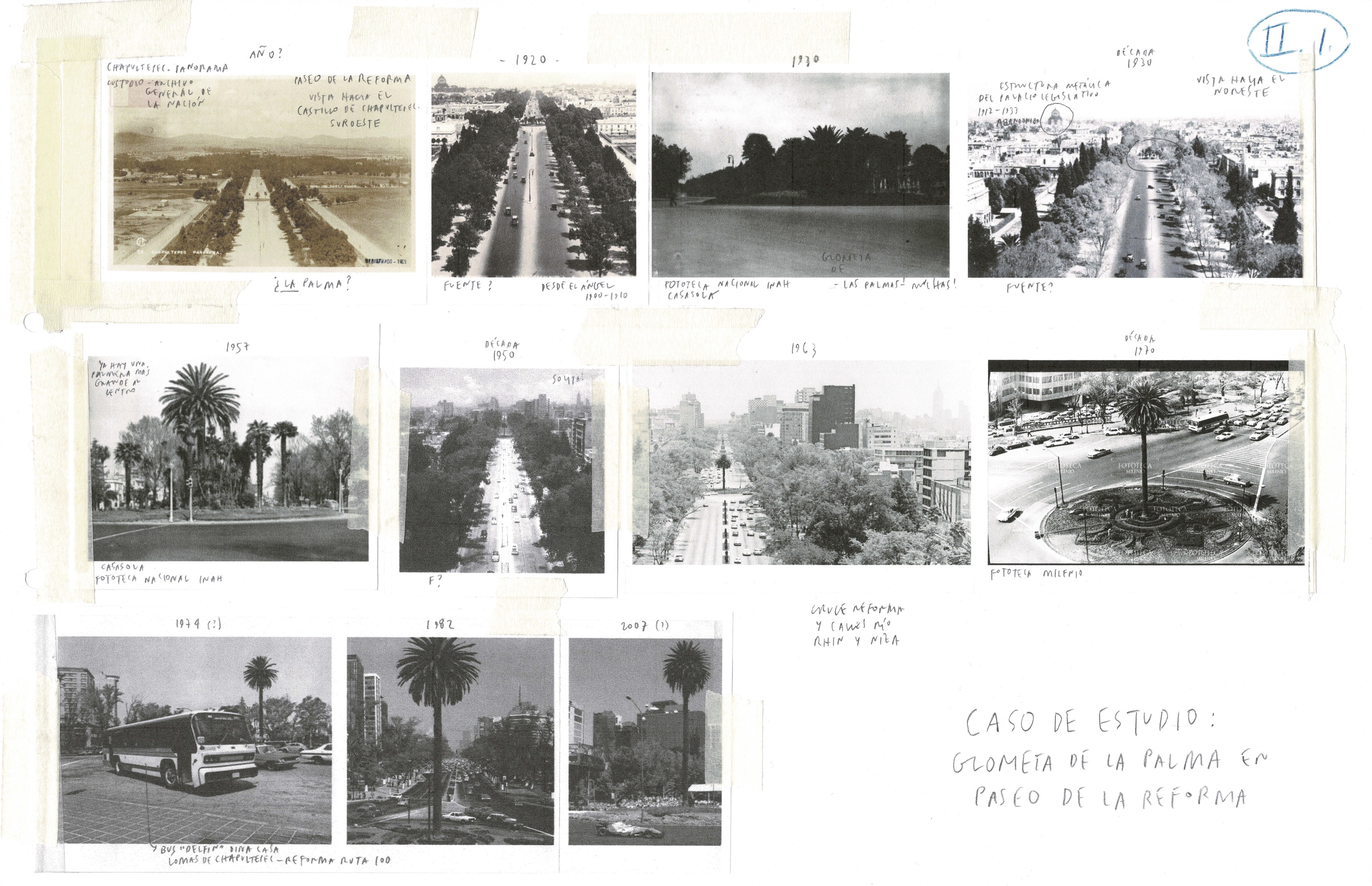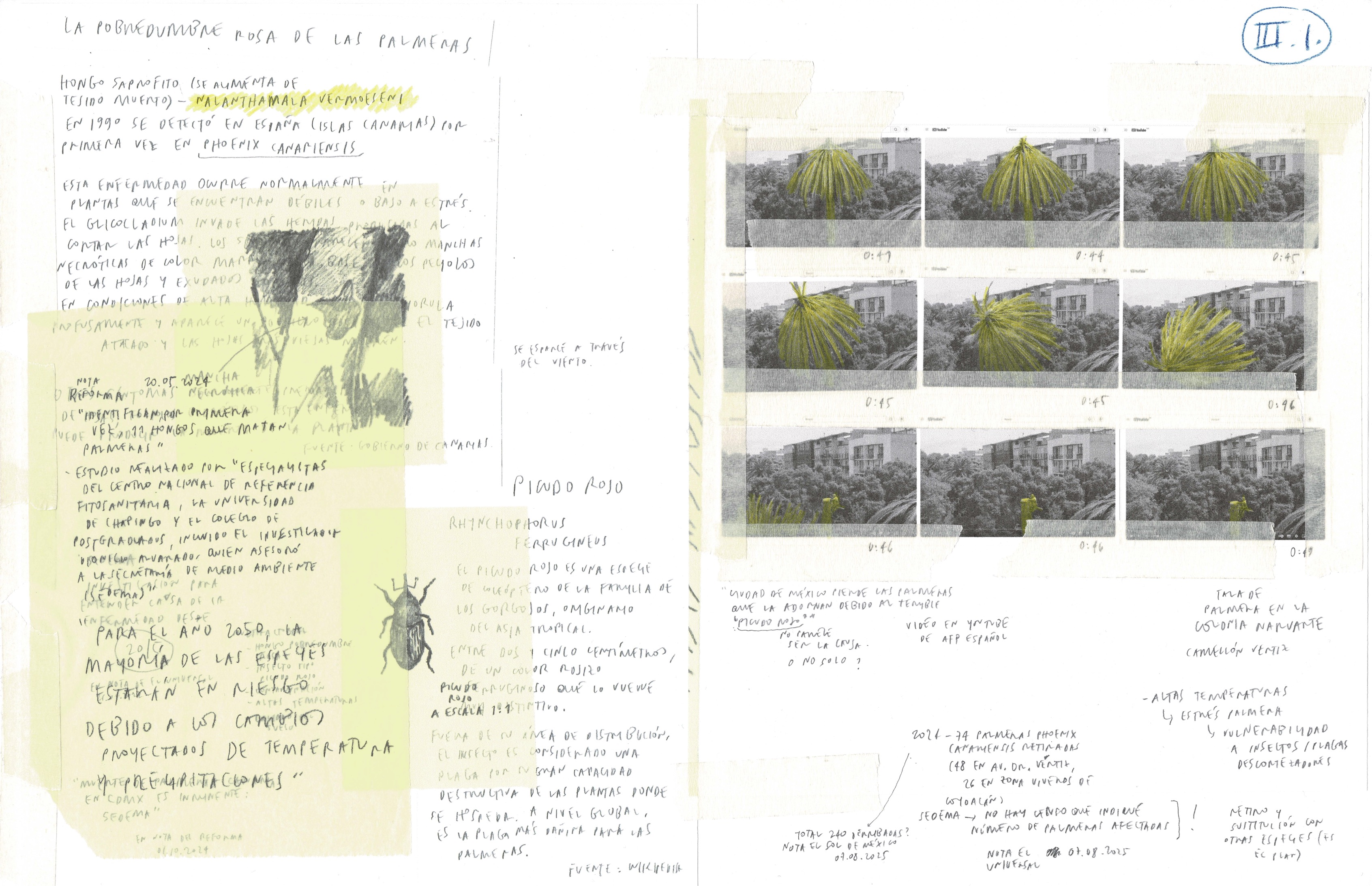 El archivo gráfico recopila fotografías, información publicada y asociaciones personales en torno a la muerte de las palmeras, y utiliza el dibujo y el collage como herramientas de investigación. Organizado en capítulos de estudio, el archivo explora la procedencia de esta especie de palma, la llegada a la ciudad a principios del siglo XX como ornamento, la presencia urbana y el arraigo social, así como las causas y consecuencias de su muerte. El trabajo es una reflexión acerca de la transformación del paisaje urbano —y de nuestra relación como habitantes con él— como consecuencia del cambio climático. Los troncos de las palmeras muertas permanecen como monumentos del siglo XXI.